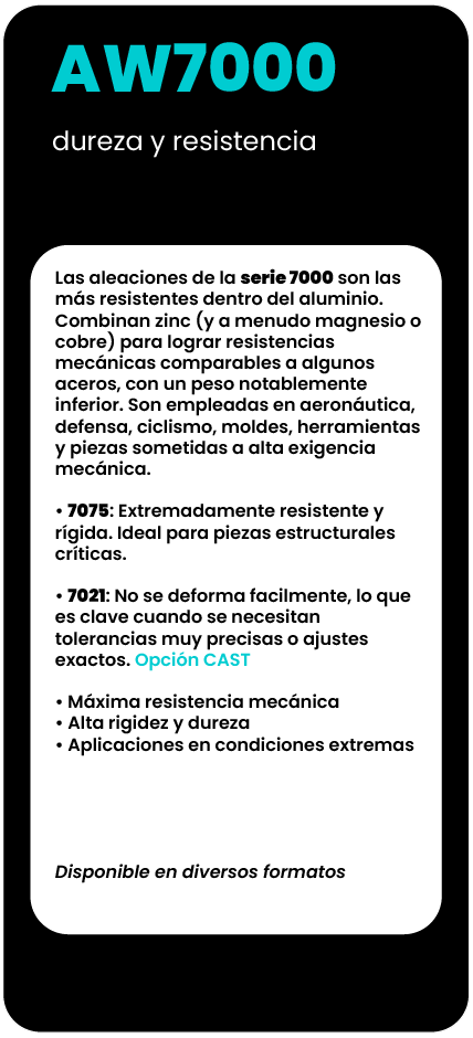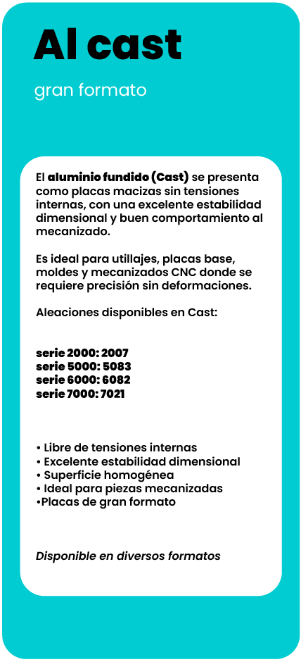 Contamos con un extenso catálogo de aleaciones de aluminio en stock (series 1000, 2000, 5000, 6000, 7000), en múltiples formatos: placas, barras, perfiles, cuadrados, tubos...